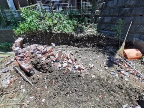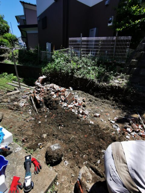 中の土を出して、レンガ砕いて、基礎掘り起こして